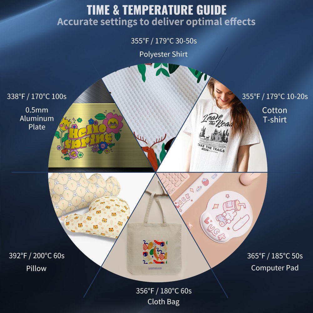 Aceasta presa termica este ideala pentru a imprima o gama larga de articole: tricouri, puzzle-uri, mouse pad-uri, ghiozdane, stegulete, etc. Este potrivita pentru imprimarea termica a tesaturilor, ceramicii, metalelor sau a altor materiale proiectate pentru transferul de caldura.
