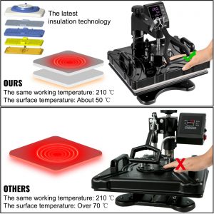 Cea mai recenta tehnologie de izolare cu doua straturi asigura temperatura suprafetei presei de tricouri de numai aproximativ 50 ℃ atunci cand temperatura de lucru atinge 200 ℃.